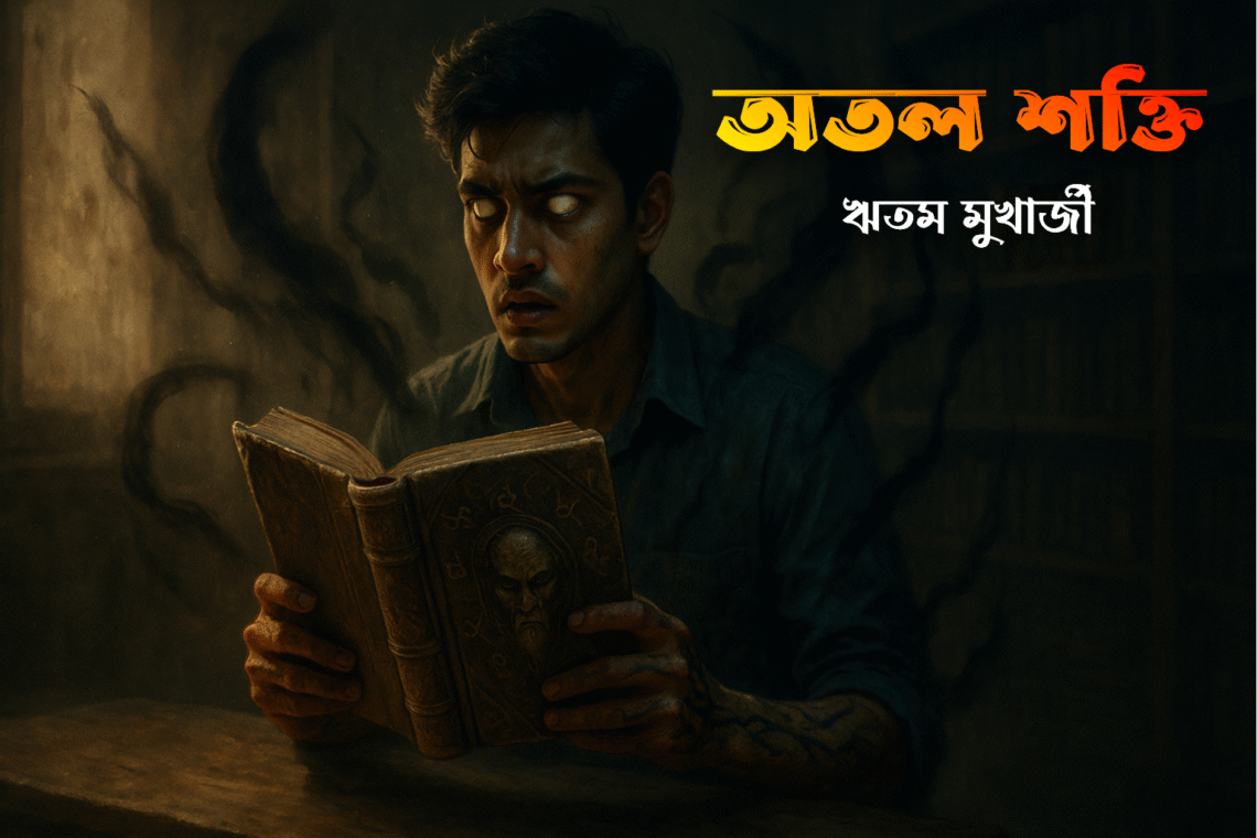 সময় যত বাড়ল, তার চারপাশের বাস্তবতা আরও বিকৃত হতে থাকল। বইয়ের পাতা নিজেই নড়াচড়া করছে, লেখা অক্ষরগুলো ধীরভাবে ঝাপসা হয়ে অন্য আকৃতি নিচ্ছে। অদিত্যর দৃষ্টি যেন অবরুদ্ধ; সে লক্ষ্য করল, নিজের হাতের আঙুলগুলো স্বাভাবিক রঙ হারাচ্ছে, অস্বাভাবিকভাবে লম্বা, পাতলা হয়ে যাচ্ছে। কক্ষের প্রতিটি প্রাচীর যেন ভেসে উঠছে, এবং বাতাসে ভেসে আসা গন্ধ তার মস্তিষ্ককে বিভ্রান্ত করছে। হঠাৎ, সে নিজেকে টেবিলের পাশে বসা প্রতিফলনে দেখে—ছায়ার অর্ধেক অংশ তার শরীরের থেকে আলাদা, অদ্ভুত অন্ধকারে ঢাকা। সে শিহরিত, কিন্তু কোনোভাবে ভয় নয়, বরং অদ্ভুত উত্তেজনা। বুঝতে পারে, বইটি তার শরীর ও আত্মার মধ্যে প্রথম রূপান্তর ঘটাচ্ছে। মনে হচ্ছিল, প্রতিটি উচ্চারণের সঙ্গে সঙ্গে তার আত্মার কিছু অংশ বইয়ের সঙ্গে মিলিত হচ্ছে, এবং সে ধীরে ধীরে এক নতুন বাস্তবতার সঙ্গে সংযুক্ত হচ্ছে—একটি জগৎ যেখানে নিয়ম, সময়, এবং স্থান স্বাভাবিক নেই। সেই রাতটিতে অদিত্য কেবল একজন ছাত্র নয়; সে হয়ে উঠল সেই অদৃশ্য শক্তির অর্ধেক অংশ, যা শতাব্দী ধরে ‘অতল তন্ত্র’-এর ভেতরে বন্দি ছিল। বাতাসে ভেসে আসা গন্ধ, নড়াচড়া করা বইপত্র, অস্বাভাবিক ছায়া—সবকিছু মিলিয়ে এক জাগ্রত প্রলয়, যা তাকে ধীরে ধীরে নতুন সত্তার দিকে টেনে নিয়ে যায়।