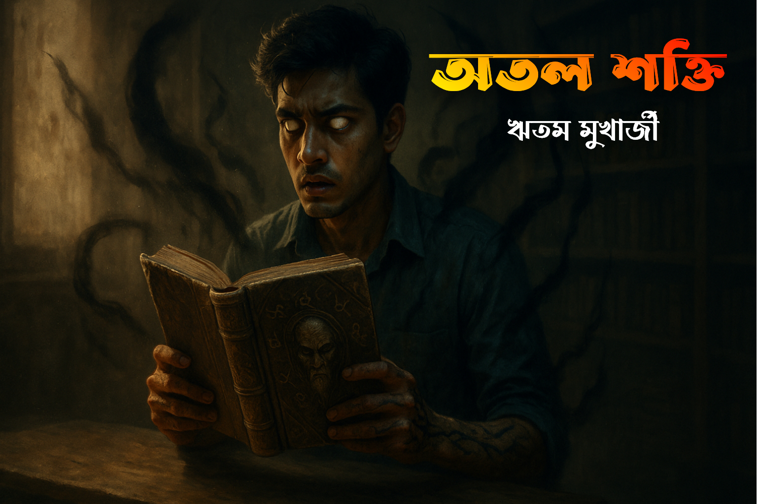 অদিত্য বইটি যখন টেবিলে রাখে, হঠাৎ যেন গ্রন্থাগারের বাতাস ভারী হয়ে ওঠে। চারপাশের নীরবতা আরও ঘন হয়, দূরের কোনো কোণে ইঁদুর ছুটে যাওয়ার শব্দও যেন কানে বাজতে থাকে। বইয়ের কভারে হাত রাখতেই তার শরীরে শিহরণ বয়ে যায়, ঠাণ্ডা স্রোত নামতে থাকে মেরুদণ্ড বেয়ে। তবুও কৌতূহল প্রবল, সে ধীরে ধীরে বইটির প্রথম পাতা উল্টায়। পাতাগুলো সময়ের ভারে ক্লান্ত, তবু প্রতিটি অক্ষরে যেন এক অদ্ভুত দীপ্তি রয়েছে, যা মৃদু আলো ছড়িয়ে টেবিলের উপর ছায়ার খেলায় মাতিয়ে তোলে। প্রথম পাতাতেই লেখা আছে—‘অতল তন্ত্র’। অদিত্য বুঝতে পারে, এটি কোনো সাধারণ বই নয়। এর ভেতরে লিপিবদ্ধ মন্ত্র, জ্যোতিষ চক্র, এবং অজানা ভাষায় লেখা মর্মর ধ্বনি—যেন কারো উদ্দেশ্যে নয়, বরং কারো বন্দিত্বকে টিকিয়ে রাখার জন্য। হঠাৎ এক অদ্ভুত অনুভূতি হয় তার, যেন অন্ধকারের ভেতর থেকে কেউ তাকে দেখছে, অদৃশ্য চোখে তাকিয়ে আছে বইয়ের প্রতিটি অক্ষরের সঙ্গে সঙ্গে। সে চোখ সরাতে চায়, কিন্তু অদ্ভুতভাবে দৃষ্টি আটকে থাকে পাতার উপর। মনে হয়, অক্ষরগুলো ধীরে ধীরে নড়ছে, মিশে যাচ্ছে, আরেকটি অজানা শব্দ তৈরি করছে, যা শূন্যতার ভেতর প্রতিধ্বনি তুলছে। তার হৃদস্পন্দন দ্রুত হতে থাকে, ঘাম জমে কপালে, অথচ কক্ষের ভেতর তীব্র ঠাণ্ডা বাতাস বইতে থাকে। বাইরে থেকে কোনো শব্দ আসছে না, কিন্তু টেবিলের চারপাশে ছায়াগুলো যেন নিজের ইচ্ছেমতো নড়াচড়া করছে, দীর্ঘায়িত হয়ে অদিত্যকে ঘিরে ধরছে।