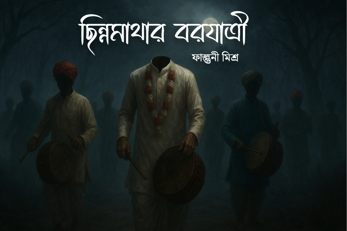 দৃশ্যটা চোখে পড়তেই হরিপদ আর কার্তিক চিৎকার করে ছুট দিল গ্রামের দিকে। বাপ্পা তো ভয়ে মাটিতে বসেই পড়ল, তারপর প্রাণপণে দৌড়ে পালাল। শুধু রণজিৎ স্থির দাঁড়িয়ে রইল। তার চোখ তখন শূন্যতার দিকে আটকে গেছে। সে স্পষ্ট দেখতে পেল, মিছিলের মাঝখানে দাঁড়িয়ে আছে এক অদ্ভুত অবয়ব—মাথাহীন বর। তার গলায় মালা ঝুলছে, হাতে এক পুরনো ধাতব শঙ্খ। বরযাত্রীরা তাকে ঘিরে ঢাক বাজাচ্ছে, আর প্রতিটি আওয়াজে চারপাশের বাতাস কেঁপে উঠছে। পূর্ণিমার আলোয় সেই বরযাত্রীরা যেন আধা-স্বচ্ছ, যেন তারা আছে আবার নেইও। রণজিতের মনে হচ্ছিল, পুরো দৃশ্যটা কোনো মৃত সময় থেকে উঠে এসেছে। তার বুকের ভেতর প্রচণ্ড শিহরণ হচ্ছিল, হাত-পা জমে গিয়েছিল, তবু সে পালাল না। বরং তার চোখের সামনে সেই মাথাহীন বর হঠাৎ হাত উঁচিয়ে শঙ্খ বাজাল, আর এক বিকট শব্দে চারপাশের আলো ঝলসে উঠল। কয়েক সেকেন্ডের জন্য মাঠটা যেন অগ্নিসাগরে ভরে উঠল, তারপর সব আবার নিস্তব্ধ। যখন রণজিৎ চোখ মেলল, তখন মাঠ ফাঁকা, কোনো বরযাত্রী নেই, নেই ঢাকের আওয়াজ—শুধু চাঁদের আলো আর নীরবতা। তার বন্ধুরা তখন অনেক দূরে পালিয়ে গেছে, কিন্তু রণজিৎ দাঁড়িয়েই রইল, মুখে নিঃশ্বাস কাঁপছে, চোখে এক অদ্ভুত জেদ। সে বুঝল, আজ সে সত্যিই এমন কিছু দেখেছে, যা কেবল লোককথা নয়, বরং এক অভিশপ্ত বাস্তব।