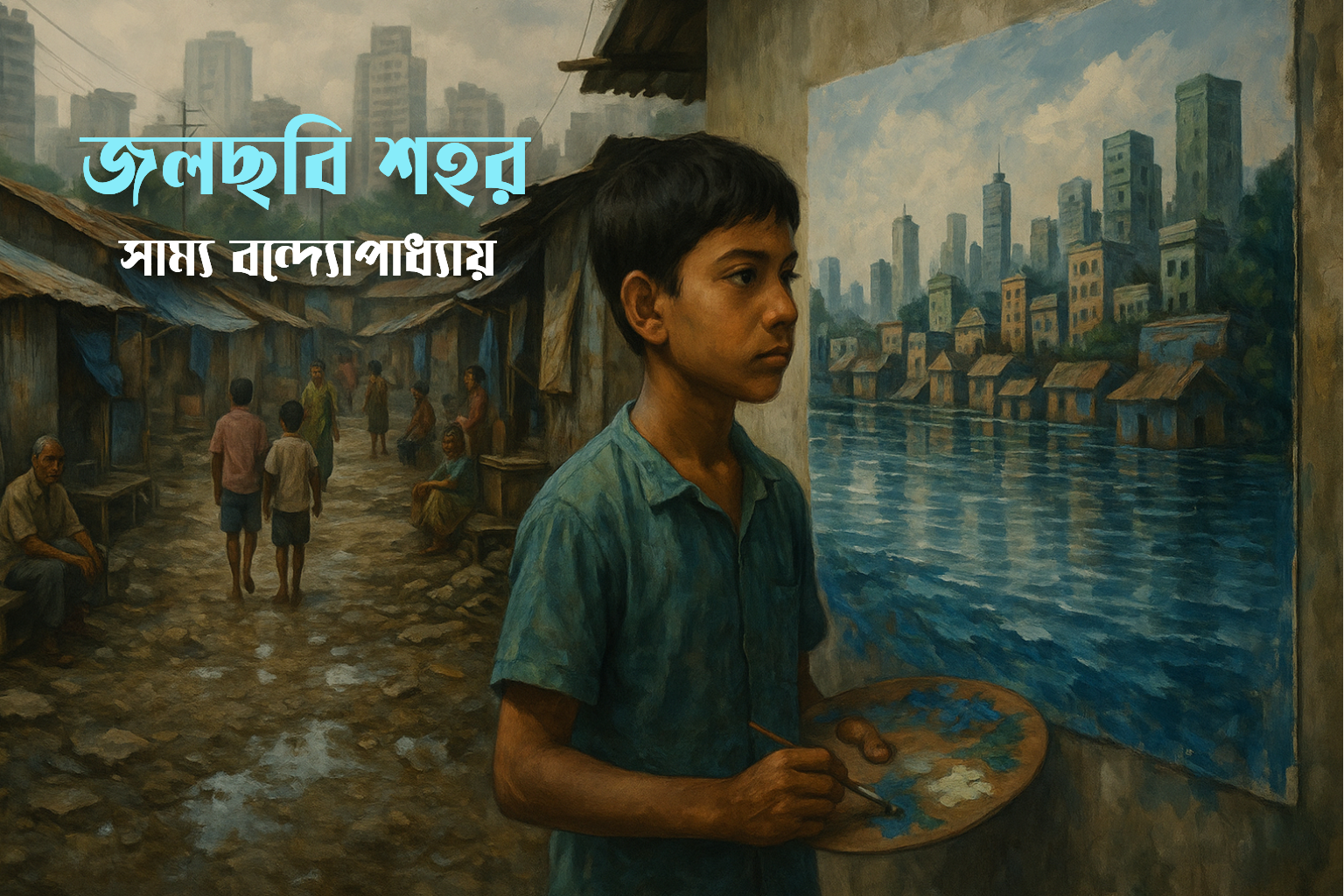 দেয়ালচিত্র প্রতিযোগিতার দিন সকালেই রঞ্জন উঠে পড়ে, চোখে একরাশ আলো আর বুকের ভেতর ঢেউয়ের মতো কাঁপুনি। স্কুল থেকে দশজনকে বাছা হয়েছে—তাদের ছবি দেওয়ালের গায়ে আঁকা হবে শহরের পুরনো পুরসভার পাঁচিলজুড়ে। সবার সামনে দেওয়া হয়েছে একটা করে ক্যানভাস, রঙ, ব্রাশ আর বিষয়—“আমার শহর, আমার স্বপ্ন।” বাকিরা আঁকছিল চেনা শহরের দৃশ্য—বাস, উড়ালপুল, ট্রাফিক, বহুতল ভবন। কিন্তু রঞ্জনের ছবিতে শহরটা ছিল অন্যরকম—তার জলছবির শহর ছিল এক নদীর দুই পাড়ে গড়ে ওঠা দুটি পৃথিবীর সংযোগ। এক পাশে গ্রাম—ধানের খেত, খেজুরগাছ, নৌকা আর চৌচালা ঘর; অন্য পাশে শহর—ফ্ল্যাট, সিগন্যাল, মোবাইল টাওয়ার। মাঝখানে ছিল একটিই নদী, যার জলে প্রতিফলিত হচ্ছিল উভয় দুনিয়ার ছায়া। নদীর ওপর দিয়ে হাঁটছিল এক কিশোর, যার চোখের দিকে তাকালেই বোঝা যায়—সে কোথাও পৌঁছায়নি, কিন্তু চলতে শিখেছে।