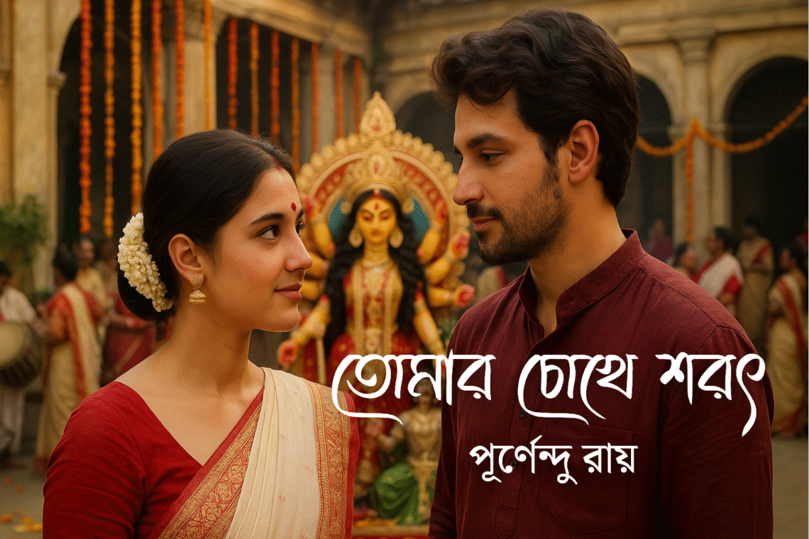সপ্তমীর সকাল। শ্যামপুকুর প্যান্ডেল তখন গন্ধে-মালায়-আলোয় এক মোহময় জাদু। ধুপকাঠির ধোঁয়া ধীরে ধীরে উপরে উঠে যাচ্ছে, বাতাসে গন্ধ—শিউলি, গাঁদা আর প্রণামের মিষ্টি ফুল। ঠাকুরের সামনে বসে কাঁসর, শঙ্খ আর ঢাকের তালে সকালটা যেন এক অলৌকিক অভিষেক হয়ে উঠেছে। অরিত্র ধুতি-পাঞ্জাবি পরে এসেছে আজ, মনে হচ্ছে নিজের মধ্যেই একটা ভিন্ন মানুষ সে হয়ে গেছে। পায়ের নিচে কাঁদামাটির আলপনা, সামনের চোখে পূজার বিশাল প্রতিমা, তার পাশে ছোট ছোট প্রদীপ। কিছুটা দূরে কৃপা বসে আছে, তার পরনে হালকা রঙের শাড়ি, চোখে বিনা প্রসাধনের এক অনন্য আলো। সে আজ তার দাদুর পাশে বসে, ঠাকুরকে প্রণাম করে, আর নিঃশব্দে কিছু বলে চলেছে, হয়তো কোনও মন্ত্র উচ্চারণ করছে, অথবা মনে মনে তার মৃত বাবার কথা ভাবছে। অরিত্র দাঁড়িয়ে থেকে দেখে, দেখে যে ঠিক পূজোর এই মাঝখানেও, শঙ্খধ্বনির মধ্যে কৃপা যেন এক ভিন্ন জগতে চলে গেছে। একসময় তাদের চোখ মেলে, আর তখনকার সেই মুহূর্তটা ঠিক যেন সময়কে আটকে ফেলে—চোখে চোখ রাখা, কিছু না বলা, অথচ অনেক কিছু বলা। পুজো শেষে প্রসাদ নিতে গিয়ে দু’জন আবার মুখোমুখি হয়। একি কাকতালীয়? না কি কোনও অদৃশ্য ছায়া তাদের একই লাইনে এনে দাঁড় করিয়েছে?