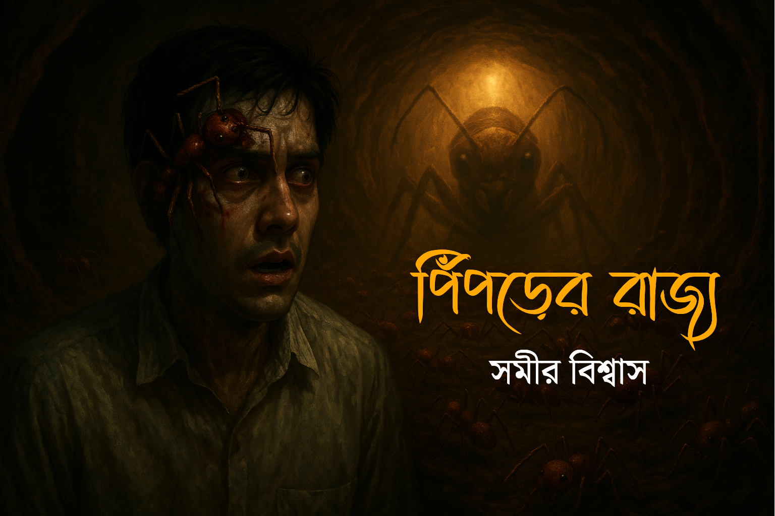 রাত নেমে এলে সে বাইরে গিয়ে দাঁড়ায় খামারের উঠোনে। আকাশে চাঁদ নেই, তার বদলে আছে ছায়ায় ভরা নৈঃশব্দ্য। সে চুপচাপ দাঁড়িয়ে থাকে, চোখ বন্ধ করে, আর তার চারপাশে একে একে বেরিয়ে আসে লালচে পিঁপড়েগুলোর দল—মাটির ফাঁক থেকে, গাছের কাণ্ড থেকে, এমনকি তার নিজের জুতোর ফাঁক থেকে। তারা হেঁটে আসে তার পায়ের দিকে, হাঁটুতে, কোমরে, বুকের উপর, কাঁধ বেয়ে উঠে পড়ে তার ঘাড়ে, গালে। সায়ন্তন নড়ে না। সে অনুভব করে না, সে উপলব্ধি করে—ওরা এখন এক, এবং সে তাদের অংশ। তার চামড়ার নিচে যেন নতুন কোনও জৈবতা জন্ম নিচ্ছে, নতুন কোষ, নতুন ইচ্ছাশক্তি। সে তখন মুখ খুলে বলে, অদৃশ্য কণ্ঠে, “হ্যাঁ, রাণী। আমি প্রস্তুত।” সেই শব্দ কোনও মানুষের উদ্দেশ্যে নয়, পৃথিবীর কোনও প্রাণী নয়—সেটা এক সমষ্টিগত বুদ্ধির জন্য, এক এমন বর্ণবিহীন সভ্যতার জন্য, যা শব্দের বাইরে, স্পন্দনের ভিতরে বাস করে। সেদিন, সায়ন্তন বসু আর থাকেন না একজন গবেষক, বরং হয়ে ওঠেন এক সম্প্রসারিত জৈব সাম্রাজ্যের প্রথম ঘোষক, যার দেহে জন্ম নিচ্ছে এক ভবিষ্যতের সভ্যতা—চুপচাপ, হিসেবমতো, নিয়ন্ত্রিত—পিঁপড়ের রাজ্য।