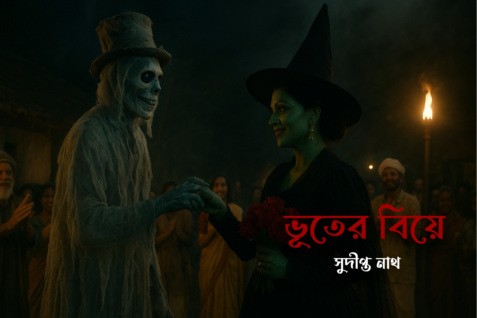 গ্রামের সকালের সূর্যটি কেবল ঢেউ খেলছিল ধানক্ষেতের ওপর, যখন গ্রামের মঞ্চে একটি অদ্ভুত নীরবতা বিরাজ করল। সবাই জানত, আজ কিছু অস্বাভাবিক ঘটতে চলেছে। ঠিক তখনই, হঠাৎই মঞ্চের মাঝখান থেকে একটি গভীর, ঝাঁঝালো কণ্ঠে ঘোষণা হল—“আমার জন্যে পাত্রী চাই!” শব্দগুলো যেন চারপাশের সব কিছুকে থামিয়ে দিয়ে অদ্ভুত এক স্থিরতা তৈরি করল। গ্রামের লোকেরা প্রথমে হতবাক হয়ে যায়, কেউ খালি চোখে মঞ্চের দিকে তাকিয়ে থাকে, কেউ আবার ধীরে ধীরে পেছনে সরে আসে। কৌতূহল আর ভয়ের মিশ্রণে সব চোখ মঞ্চে। কেউ হাসি থামাতে পারছিল না, আবার কেউ ভয়ে কাঁপছে। বুড়ো মজুমদার, যিনি গ্রামের খবরাখবরের দায়িত্বে ছিলেন, প্রথমে অবিশ্বাসের সঙ্গে মাথা নাড়িয়ে, তারপর ঢাক-ঢোলের সঙ্গে খবরটি সবখানেই ছড়িয়ে দিল। গ্রামের প্রতিটি গলিপথ, বাড়ি, দোকান—সব জায়গায় লোকজন আলোচনা শুরু করল। কেউ বলল, “ভূতরাজ কি সত্যিই বিয়ে করতে চায়?” আবার কেউ ব্যঙ্গ করে বলল, “অবশ্যই, এখন ভূতরাও সময়ে সময়ে নিঃসঙ্গ নয়।”