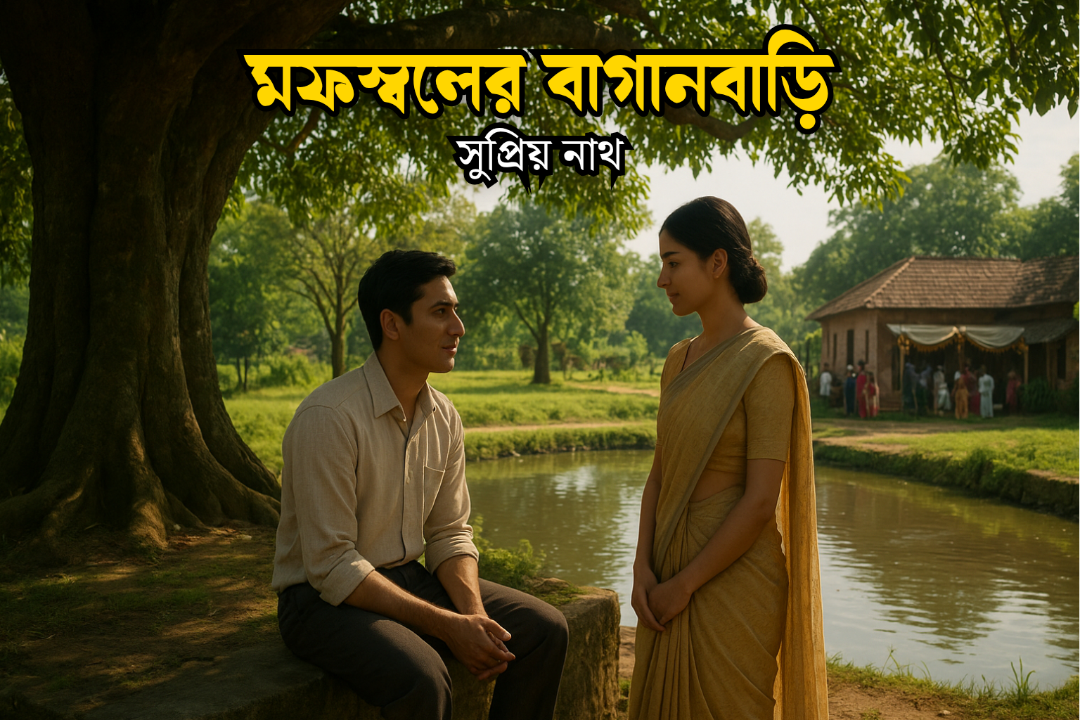 চাঁদের আলোতে তাদের দু’জনের ছায়া গাছের নিচে লম্বা হয়ে পড়েছিল। দূরে বউভাতের গান এখনো ভেসে আসছিল, কিন্তু এখানে যেন আরেকটা জগত গড়ে উঠেছিল—যেখানে ছিল শুধু অরিত্র আর মেঘলা। অরিত্র ধীরে ধীরে বলল, “আমি জানি না ভবিষ্যতে কী হবে, কিন্তু আমার মন চাইছে বারবার ফিরে আসতে, তোমাদের কাছে, এই গ্রামে, এই গাছটার তলায়।” মেঘলার চোখে জল চিকচিক করছিল, কিন্তু সে জোর করে হাসল। “আমি জানি, তুমি আসবে,” সে বলল, “কারণ এই জায়গা তোমাকে ডাকবে বারবার। যত দূরেই যাও না কেন, মনে রেখো, এখানে কেউ তোমার জন্য অপেক্ষা করে থাকবে।” তার কণ্ঠে একটা নিশ্চয়তা ছিল, আবার ছিল ভয়—যেন সময় সবকিছু মুছে দেওয়ার আগেই এই মুহূর্তটাকে আঁকড়ে ধরতে চাইছে। দু’জনের মধ্যে আর কোনো বাড়তি কথা হল না। শুধু নীরবতার মধ্যেই তারা ভাগ করে নিল অনেক না-বলা অনুভূতি।