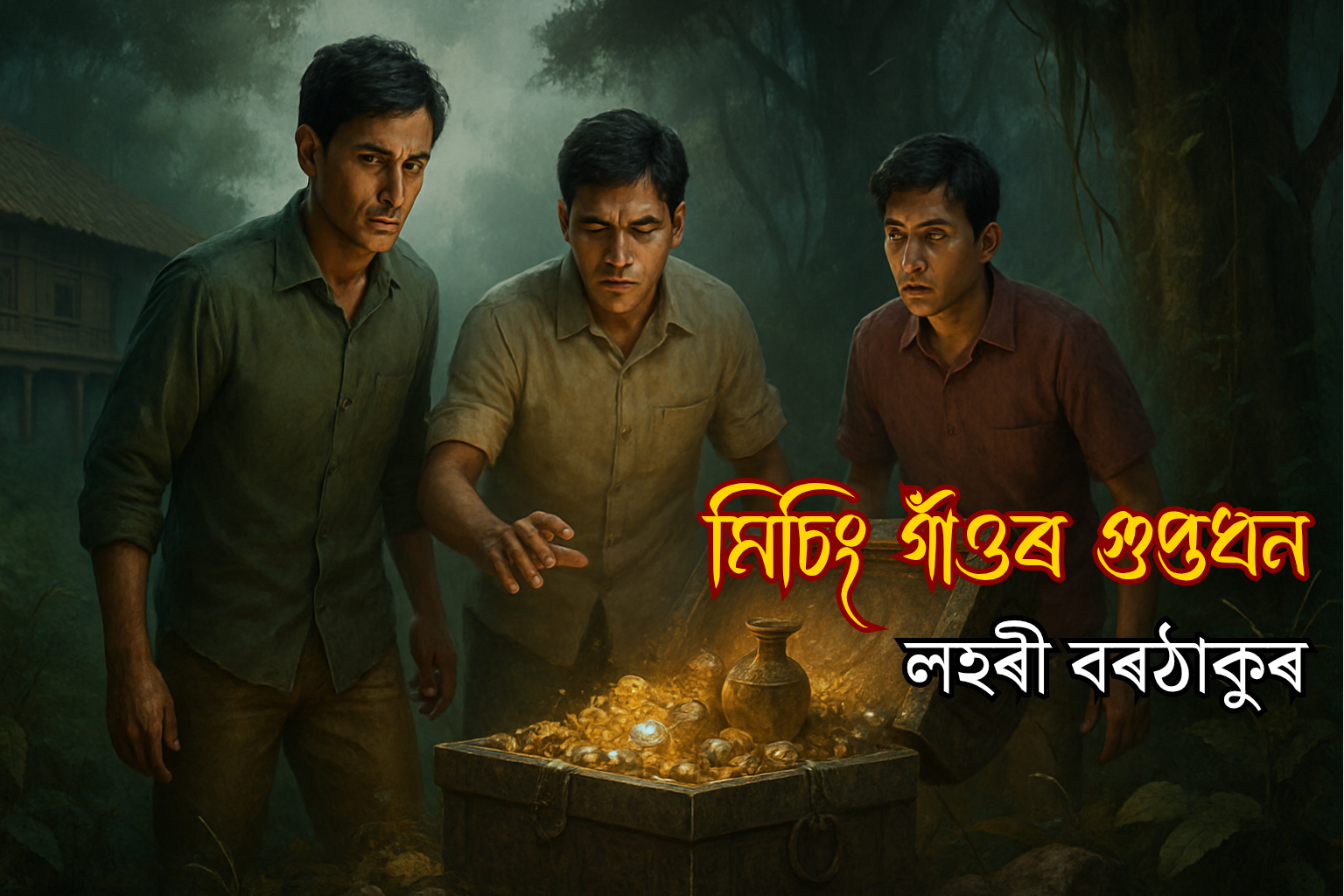 বিকাশ, পবন আৰু দিপু—তিনিজনেই শৈশৱৰ বন্ধু, গুৱাহাটী চহৰৰ এটি খুদাকৈ অলিগলিৰ মাজেৰে সময় অতিবাহিত কৰা, স্কুলৰ বেঞ্চ ভাগ কৰি লোৱা আৰু পুস্তক-পত্ৰৰ মাজে সপোন গাঁথা জীৱনৰ সঙ্গী। কলেজৰ গ্ৰীষ্মকালীন বন্ধত তেওঁলোকে সিদ্ধান্ত লয় এবাৰ নিৰ্জন ঠাইত ভ্ৰমণ কৰিবলৈ যোৱাৰ; গুৱাহাটীৰ বোলচাল, হৈচৈ আৰু বেয়া বতৰৰ পৰা বহু দূৰ, ক’ত বাৰিষাৰ জলেৰে নুমাই থকা নদী, কুঁৱলীৰ আঁৰ আৰু বনজাৰুলিত ঠাই। পবনৰ কাকাই যি আগতে অসমৰ গাঁও-বন ঘূৰি ফুৰিছিল, তেওঁ এজন বৃদ্ধৰ কথা কৈছিল, যি ৰেলগাড়ীত সহযাত্ৰী হৈ মিচিং গাওঁৰ কথাৰ লগত এজন অচিন্তনীয় গুপ্তধনৰ কাহিনী জোড়িছিল। সেই দিনটো অতি বতাহীয়া আছিল, গুৱাহাটী ষ্টেচনত ৰেলগাড়ীৰ এজাক হুইসেলৰ মাজত সেই বৃদ্ধই কয়—“বাবু, মিচিং গাঁও কেতিয়াবা শুনিছা? সেই গাঁওৰ কাষৰ বনত এক গুপ্তধন লুকাই আছে, বহু শতাব্দীৰ পূৰ্বে মোগল বংশৰ সৈন্যসকলে তাত লুকুৱাই থৈ গৈছিল। কিন্তু তাক উদ্ধাৰ কৰিবলৈ সাহসিকতা লাগে, কাৰণ সেই ধনৰ ওপৰত আছে এক অভিশাপ—যি লোভী হ’ব, সেইজনৰ মৃত্যু নিশ্চিত।” এই কথাবোৰে বিকাশৰ মাজত অদ্ভুত কৌতূহল সৃষ্টিকৰিলে। পৱনে চাহকাপৰ চুমুক দিয়া ৰখি বৃদ্ধজনৰ চকুত গভীৰ মনোযোগে চাই থাকিল আৰু দিপুৰ মনত এবাৰ ভয়, এবাৰ আশ্চৰ্য মিলে ক’তাপি বন্ধুৰ সৈতে যাত্ৰা কৰিবলৈ ইচ্ছা জন্মালে। সেই ৰাতি তেওঁলোকে নিজৰ কামোৰডৰ ওচৰত বহি মানচিত্র আঁকিবলৈ চেষ্টা কৰিলে, একে লগে গুগল মেপত মিচিং গাঁও চাবলৈ আৰম্ভ কৰিলে আৰু সিদ্ধান্ত ল’লে—সেই গাঁওলৈ গ’ম, যি কোনো বিপদ হ’ব, মোকাবিলা কৰিম।
