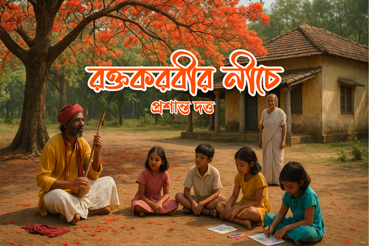 সেই পাঠশালার প্রথম দিনে একটা ছোট্ট মঞ্চ তৈরি হয়। কেউ কিছু লেখেনি, কেউ কোনও উদ্বোধনী বক্তৃতাও দেয়নি। শুধু সুধাংশুবাবু গেয়ে ওঠেন রবীন্দ্রনাথের সেই চিরন্তন পংক্তি—“আজি এ প্রভাতে রবি তব উদয় গিরিধারে…”। আর রিনু, তার হাতে এক গুচ্ছ পেন্সিল নিয়ে সামনে এসে বলে, “আজ থেকে আমরা সবাই মিলে গল্প বলব। কেউ শুনবে, কেউ বলবে, কেউ ছবি আঁকবে।” হঠাৎ করে ছোট্ট এক ছেলেও উঠে বলে, “আমি গান গাইব”—এমনভাবে, যেন রামকেলির আত্মা আবার একতারা হাতে পাশে দাঁড়িয়ে গেছে। আশ্রমের পুরনো দেওয়ালে একটা নাম লেখা হল—‘রক্তকরবীর নীচে’—নিচে ছোট করে, “যেখানে গান থামে না।” যেন একটা আন্দোলন শুরু হল—নীরব, ধুলোবালি মেশানো, কিন্তু অশেষ শক্তিশালী।