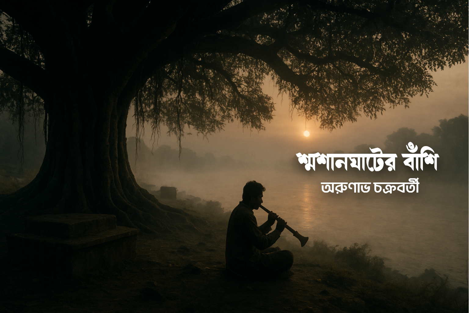 গঙ্গার ধারে বরানগরের শ্মশানঘাট যেন সময়ের বাইরে দাঁড়িয়ে থাকা এক এলাকা। এখানে নদীর জল যেন অন্য রকম ছন্দে বয়ে চলে—দিনে আলো আর নৌকার কোলাহলে ভরা হলেও রাত নামলেই চারপাশে এমন এক নীরবতা নেমে আসে, যা মানুষের বুকের ভেতর কেমন একটা শূন্যতা তৈরি করে দেয়। পুরনো, বিশাল এক বটগাছ মাথা উঁচু করে দাঁড়িয়ে আছে ঠিক শ্মশানের পাশে, যার শিকড়গুলো মাটির ভেতর থেকে উঠে এসে কুণ্ডলী পাকিয়ে গিয়েছে, যেন মৃত মানুষের হাড়গোড় নদীর বাতাসে দুলছে। গাছের গায়ে শত বছরের শ্যাওলা, পেছনে নদীর কালো জলে পূর্ণিমা বা অমাবস্যার চাঁদের প্রতিফলন, আর দূরে জ্বলতে থাকা চিতার আগুনের লাল আভা—সব মিলিয়ে এক ভৌতিক চিত্রকল্প। রাত যত গভীর হয়, শ্মশানের দিক থেকে আসে কাঠ ফাটার শব্দ, হালকা ধোঁয়ার গন্ধ, আর মাঝে মাঝে গঙ্গার ঢেউয়ের সঙ্গে মিলেমিশে ভেসে আসে অদ্ভুত এক বাঁশির সুর। গ্রামে গুঞ্জন, এই সুর বাজায় কেউ জীবিত নয়—বরং বহু বছর আগে মারা যাওয়া এক সানাইওয়ালা, যে মৃত্যুর পরও তার শেষ অসমাপ্ত সুর বাজিয়ে যেতে চায়।