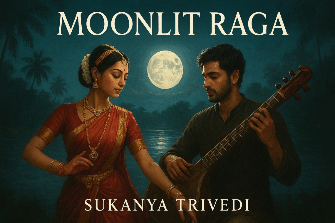 As the sun dipped lower toward the horizon, casting long shadows across the courtyard, the rehearsals began to take on an almost hypnotic rhythm. The interplay of Anjali’s graceful movements and Dev’s melodic strains seemed to blur the boundaries of time, transporting them to an ancient era where art was not a performance but a way of life. The gentle lapping of the backwaters nearby punctuated their practice, creating a natural cadence that neither had planned but both embraced. Their eyes met more often now, lingering longer, as if each gaze carried the weight of unsaid emotions. Anjali found herself drawn to the subtle way Dev’s fingers moved across the veena strings, the concentrated intensity of his expression, and the occasional, fleeting glances that seemed to hold both curiosity and restraint. The connection between them grew palpable, though neither dared to name it aloud. With the moon’s first silver light beginning to peek through the clouds, the rehearsal ended, leaving behind a lingering sense of promise. In that quiet twilight, their artistic partnership was no longer just an experiment—it was becoming something far more profound, a tender prelude to a story neither of them yet fully understood.